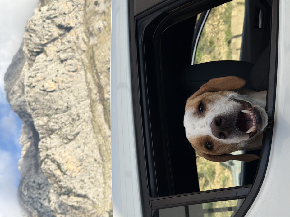 A white and tan short-haired dog is positioned with its head extended through the partially open rear passenger window of a white vehicle. The dog's mouth is open, displaying its teeth, and its dark eyes are directed forward. A dark headrest is visible in the vehicle's interior. The background features a blurred, rugged mountainous landscape with light-colored rock formations and sparse vegetation, under a partially cloudy blue sky. A faint, lighter-colored vehicle is visible in the far background through the window. This scene is located in Drobnići, Montenegro.
