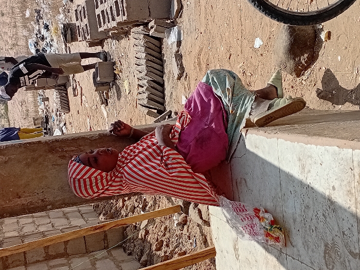 The scene depicts an outdoor construction or demolition site in Ayama, Nigeria. In the foreground, a young individual, likely female, is seated on a concrete ledge, leaning against a large vertical concrete or stone pillar. She wears a red and white striped hijab covering her head and shoulders, a dark pink top or dress, and light blue patterned trousers, with light green slippers on her feet. Her left hand is raised towards her mouth, and she appears to be looking towards the right side of the frame. A transparent plastic bag containing colored items is visible on the ledge to her left. The ground is predominantly bare, reddish-brown earth with scattered debris. To the left of the seated individual, a partially constructed cinder block wall is visible, with wooden supports leaning against it. In the mid-ground, several stacks of concrete blocks and hollow cinder blocks are arranged on the dirt. Further back, another individual, dressed in a black t-shirt, light shorts, and a white cap, is bent over near a stack of blocks. Other indistinct figures are present in the far background. Scattered waste and debris are visible across the dusty terrain. A portion of a bicycle wheel is visible on the far right of the foreground. Shadows indicate direct sunlight.