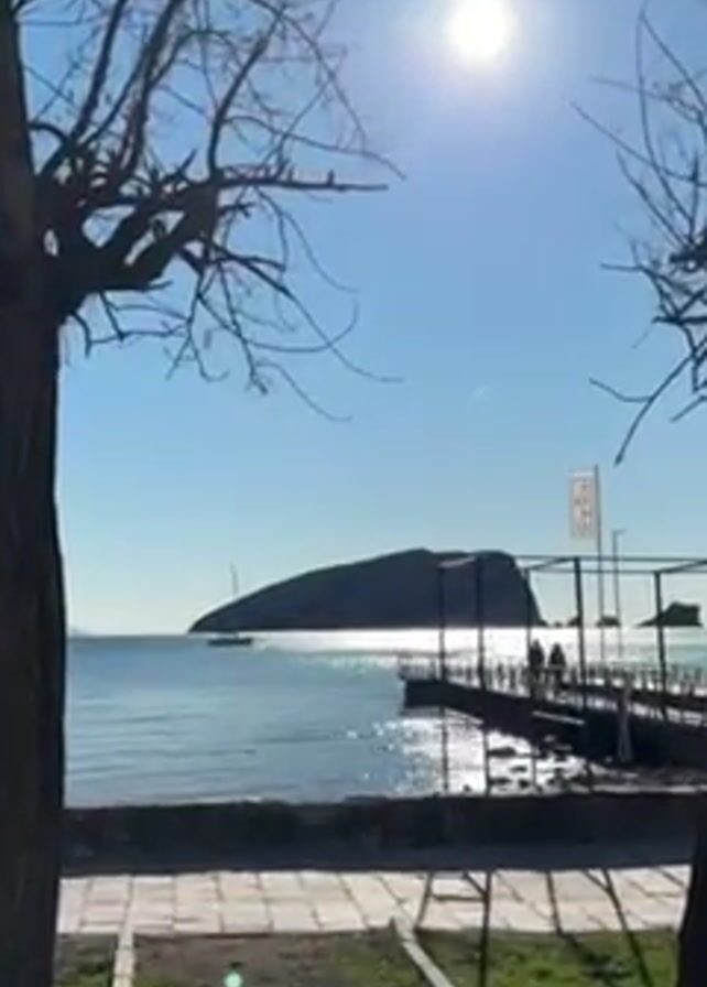 sunny coastal scene. In the foreground, there is a paved pathway with trees framing the view. Beyond the pathway, there is a calm body of water reflecting sunlight. A pier extends into the water, and several silhouetted figures are walking on it. A flag with lettering on it stands near the end of the pier. In the distance, there is a large, rocky island. A jet trail is visible in the clear blue sky.