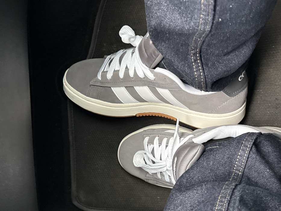 The scene is depicted from a first-person, downward perspective, showing the lower extremities of an individual. The environment is a dark, enclosed interior, consistent with a vehicle, where the feet rest upon a dark gray or black textured floor mat. No specific landmarks or environmental cues are visible to confirm the stated location in Lampertheim, France; the setting is an interior vehicle space. The subject's feet are clad in gray low-top sneakers featuring white laces, three distinct white stripes on the lateral sides, and thick, cream-colored rubber soles. A small, dark brown accent is visible on the inner side of the right shoe's sole. The right sneaker's heel displays a dark gray patch with white "adidas" branding. Dark blue denim jeans, characterized by prominent light-colored stitching along the seams and cuffs, cover the ankles and lower calves, partially obscuring the top portions of the sneakers. The individual's feet are in a resting position.