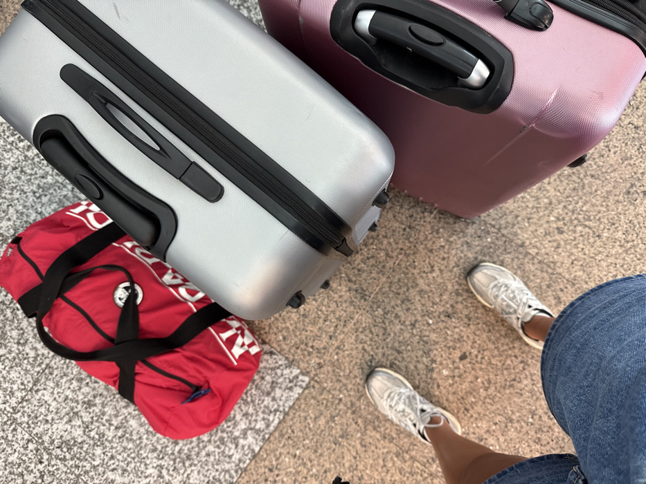 - "An eye-level, slightly angled shot shows two rolling suitcases, one light gray and one pink, and a red duffel bag on a tiled floor" by FM-CYJaF3, licensed under CC BY 4.0