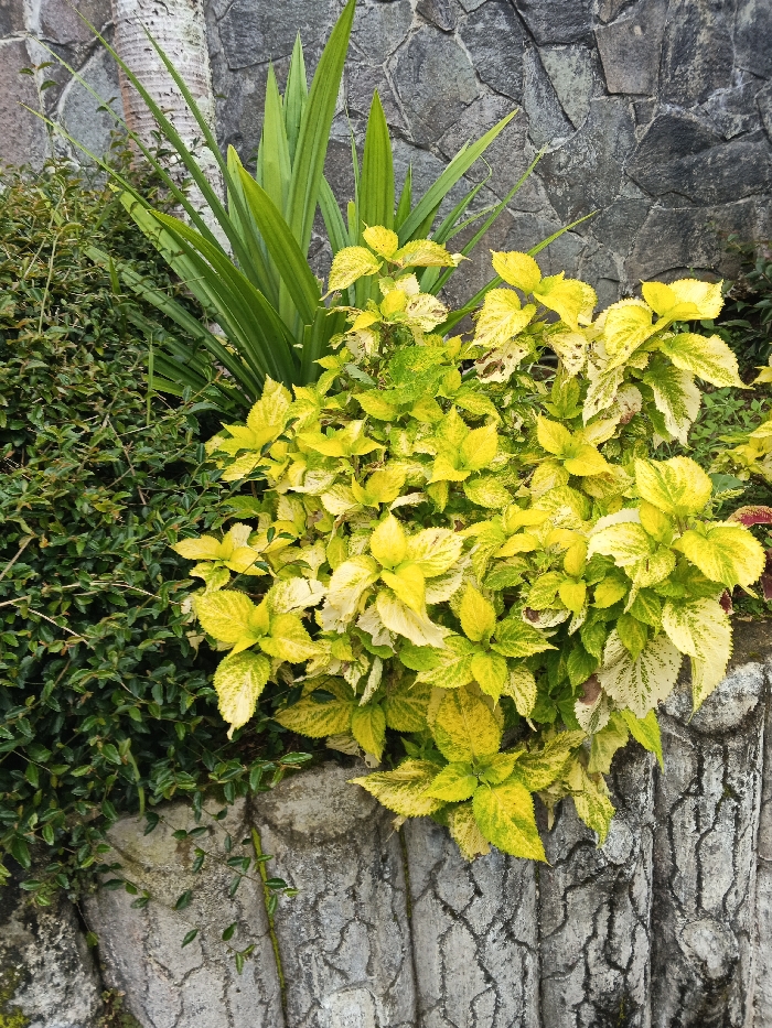 The scene depicts a detailed view of a garden or landscaped area within an unknown city in Cambodia. The lower portion of the image features a grey, textured concrete barrier or planter, with slender green vines growing along its left side. Immediately above this barrier, to the left, is a dense mass of dark green, small-leafed shrubbery. Central to the composition is a vibrant plant with variegated leaves, primarily bright yellow with patches of light green and some minor brown discoloration. Behind this plant, tall, sword-shaped green leaves are visible. The background consists of a wall constructed from irregularly shaped dark grey stones. No people are present.