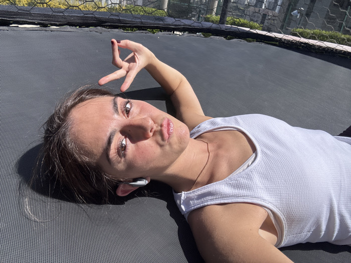 A young female lies supine on a dark grey trampoline surface, positioned in an outdoor setting under direct sunlight in Interlomas, Mexico. Her head is angled towards the camera, and her gaze is directed forward. She has dark brown hair and her lips are pursed. A light-colored earbud is visible in her left ear. She wears a white ribbed tank top and a thin, light-colored chain necklace. Her right hand is raised to the right of her head, forming a gesture with extended index and middle fingers, curled ring and pinky fingers, and an extended thumb. Her fingernails are painted dark red. A distinct shadow is cast beneath her head and left arm due to the strong sunlight. The background reveals a black trampoline safety net, behind which green foliage and indistinct light-colored structures are visible.