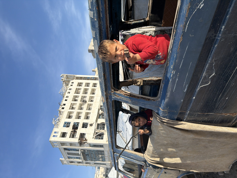 - "The image depicts two young children within a severely damaged, dark blue vehicle, positioned in what appears to be a debris-strewn outdoor setting under a clear blue sky" by FM-PSI0J3, licensed under CC BY 4.0