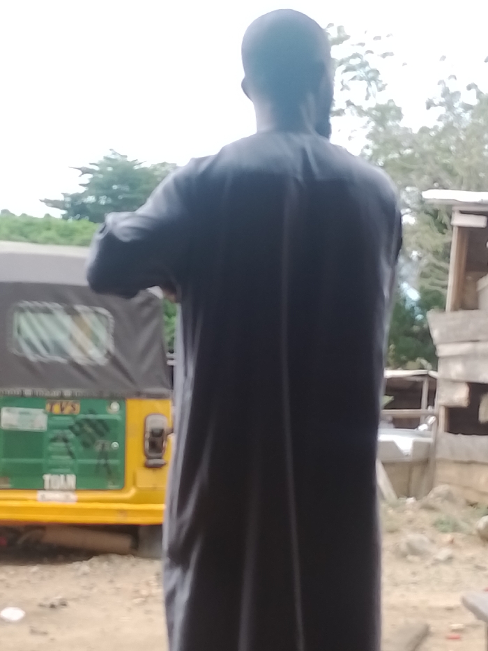 The scene depicts an unpaved outdoor area in Unknown, Unknown, observed from behind a standing male individual. The person, positioned centrally in the foreground, wears a dark, long-sleeved, tunic-style garment and has short hair, facing away from the camera towards the distant background. To the immediate left of the individual, the rear section of a three-wheeled auto-rickshaw is visible, featuring a dark canopy, a yellow lower body, and a green upper rear panel displaying the "TVS" logo and "TOAN" text. To the right of the individual, in the mid-ground, rudimentary structures composed of wood and sheet materials are present. The ground beneath is bare earth. The background reveals dense green foliage under a bright, possibly overcast, sky.