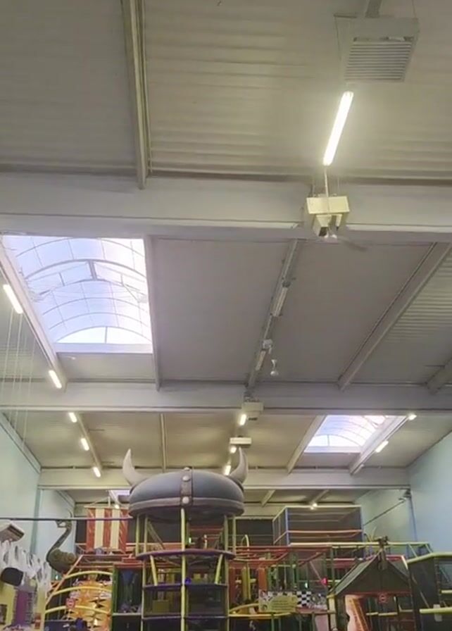 The video captures the interior of a bustling indoor playground, teeming with people, mainly adults and children. The space is brightly lit by overhead fluorescent lights and natural light filtering through skylights in the gray, corrugated metal ceiling. At the center of the frame, there's a large, multi-level play structure with tunnels, slides, and other play elements, topped with a giant Viking helmet. Numerous people are gathered around tables on the floor level, some appear to be eating and socializing. In the background, additional play equipment is visible. The camera is static, providing a wide view of the crowded indoor play area.