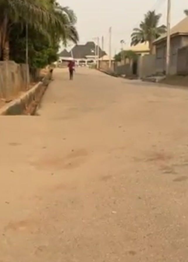 street with palm trees on the left side and houses on the right. A person in dark pants and a red shirt walks up the middle of the street away from the camera, carrying a bag on their left shoulder.
