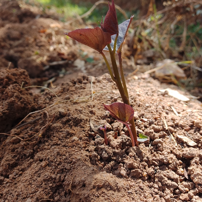 The image displays a close-up, ground-level perspective of a nascent plant sprout emerging from cultivated earth in Sámara, Costa Rica. The primary subject is a plant approximately 10-15 cm tall, characterized by a reddish-purple stem and small, cordate-shaped leaves that are predominantly maroon, with one leaf exhibiting a silvery-green underside. Immediately surrounding the main sprout, two smaller, similar reddish sprouts and a solitary small green leaf are visible, all rising from the brown, clumpy soil. The soil surface is loose and textured, forming slight mounds. The scene is illuminated by direct sunlight, creating defined highlights and shadows. The background is out of focus, revealing further disturbed brown soil and indistinct, distant vegetation, indicating an outdoor garden or agricultural setting.