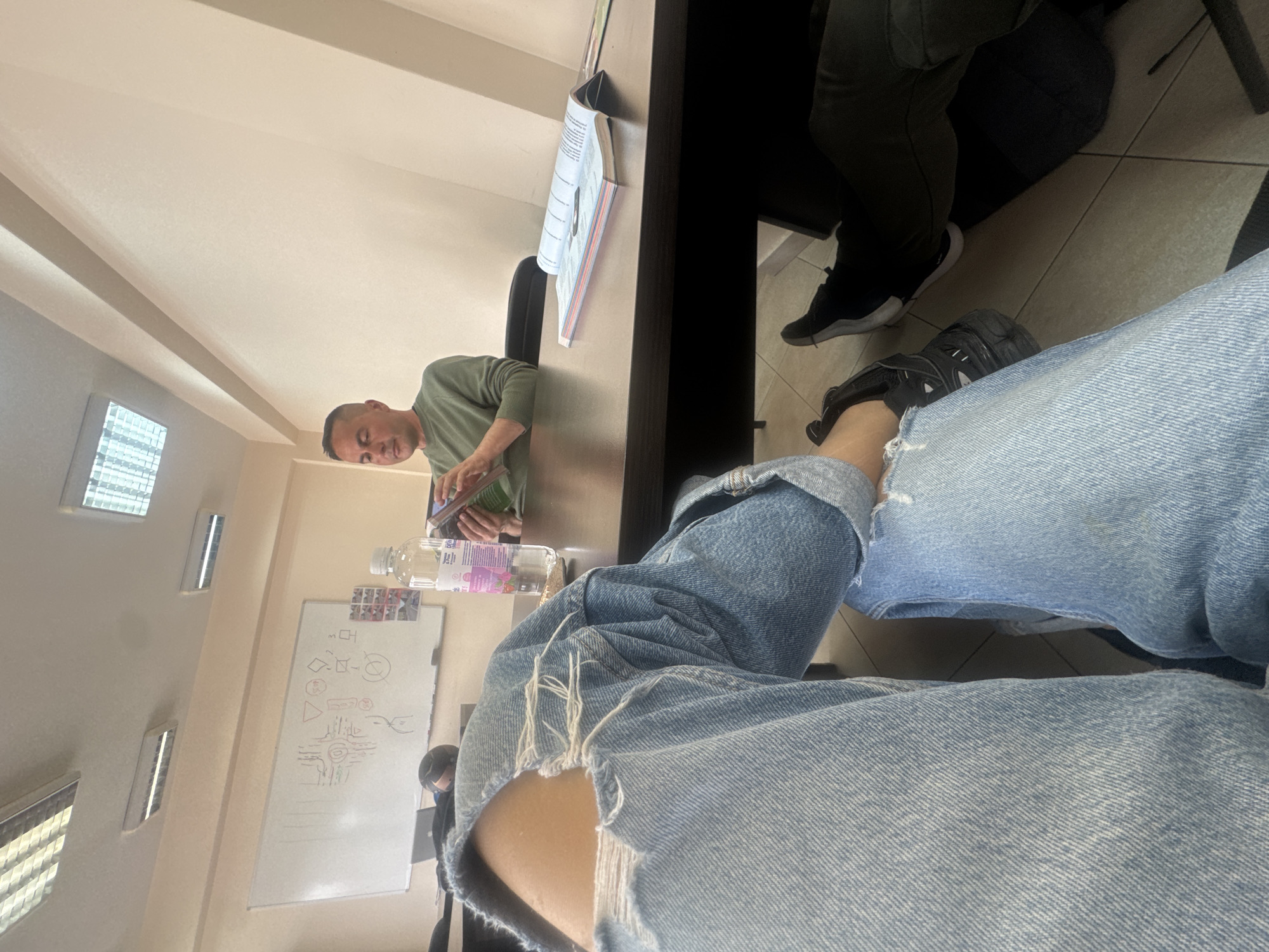 The image portrays an indoor scene within a classroom or training facility in Dimitrovgrad, Bulgaria. The perspective is from a seated individual whose upper legs and knees, clad in light blue ripped jeans, are prominent in the foreground. This individual wears black athletic shoes. In the mid-ground, a male subject with short dark hair, appearing middle-aged, is seated at a dark brown table. He is wearing a long-sleeved olive green top and is observed looking down at a small book or device held in his hands. On the table directly in front of him, to the left, rests a clear plastic bottle of mineral water with a pink label, adjacent to a small, light-colored dish. To the right of the bottle, an open textbook or binder with visible text and images is positioned on the table. Another person's lower legs, wearing dark pants and black sneakers, are partially visible beneath the table in the mid-ground, to the right of the foreground subject's legs. The background features a large white board displaying various drawings and symbols, including a detailed diagram of a traffic intersection, geometric shapes (triangle, rhombus, square), and numbers. Several small printed images are affixed to the right side of the whiteboard. Further in the background, behind additional dark brown tables, a person's head and a laptop are faintly discernible. The room possesses light-colored, possibly beige, walls and a white ceiling equipped with rectangular fluorescent light fixtures. The floor is tiled with light brown or beige squares. The scene suggests a structured learning or instructional environment.