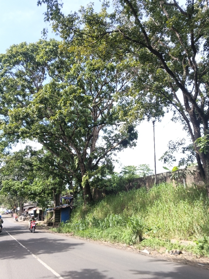 A street scene features lush green trees dominating the landscape. Dense foliage provides partial shade over the road, creating dappled light patterns. Tall grass and greenery line a hillside adjacent to the street, bordered by a low wall. A lamppost is visible against the sky. A few small structures and motorcycles suggest a roadside market or residential area.