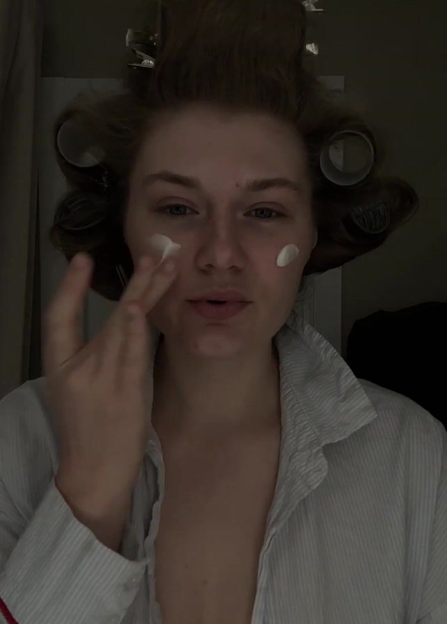 A fair-skinned woman is applying white cream on her face while looking directly at the camera. She has her hair rolled up in curlers. She is wearing an unbuttoned light-blue and white striped pajama top with red trim. The background is dark and blurry, but it appears to be an interior space.
