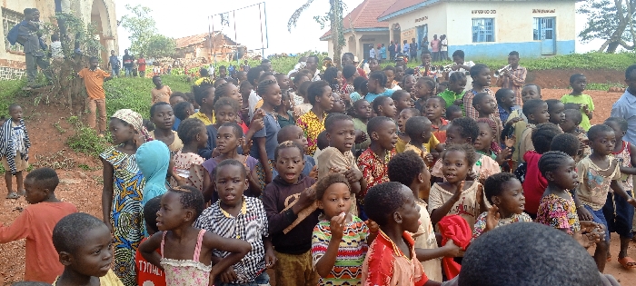 The image depicts a large gathering of individuals, primarily children estimated to be over one hundred, ranging from toddlers to adolescents, in Kundu 1, Democratic Republic of the Congo