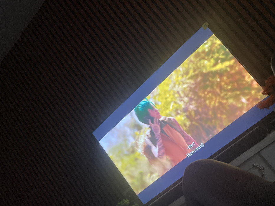 This image depicts an undisclosed indoor location in an unknown city, viewed from a low angle. A large rectangular screen, diagonally oriented, displays a vibrant scene featuring a character with teal-colored hair, wearing an orange-brown garment with distinct pinkish-purple arm markings. A hazy, dusty effect surrounds the character, who appears to be reacting, with hands near their face, against a background of bright green and yellow foliage. Subtitles on the screen read "-Me?" and "[lion roars]". In the immediate foreground, the left forearm and upper thigh of a person with medium-dark skin are visible, with a silver-toned bracelet present on the wrist. The upper portion of the image, constituting approximately two-thirds of the frame, reveals a dark surface with pronounced horizontal striping, indicative of a slatted ceiling or wall. A small cluster of green foliage is visible on the far left, and a decorative object in shades of orange and brown is situated in the bottom right corner. The ambient lighting of the room is dim, with the screen serving as the primary light source.