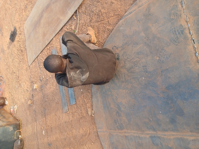 From an overhead perspective, a man in a dark jacket and light-colored boots stands on a large, dark, metal surface exhibiting weld lines. Adjacent to him is a rectangular metal sheet. Two thin metal strips lie near his feet on a dusty, reddish-brown ground. Welding equipment is visible in the lower-left corner. The overall scene suggests a construction or metalworking environment.