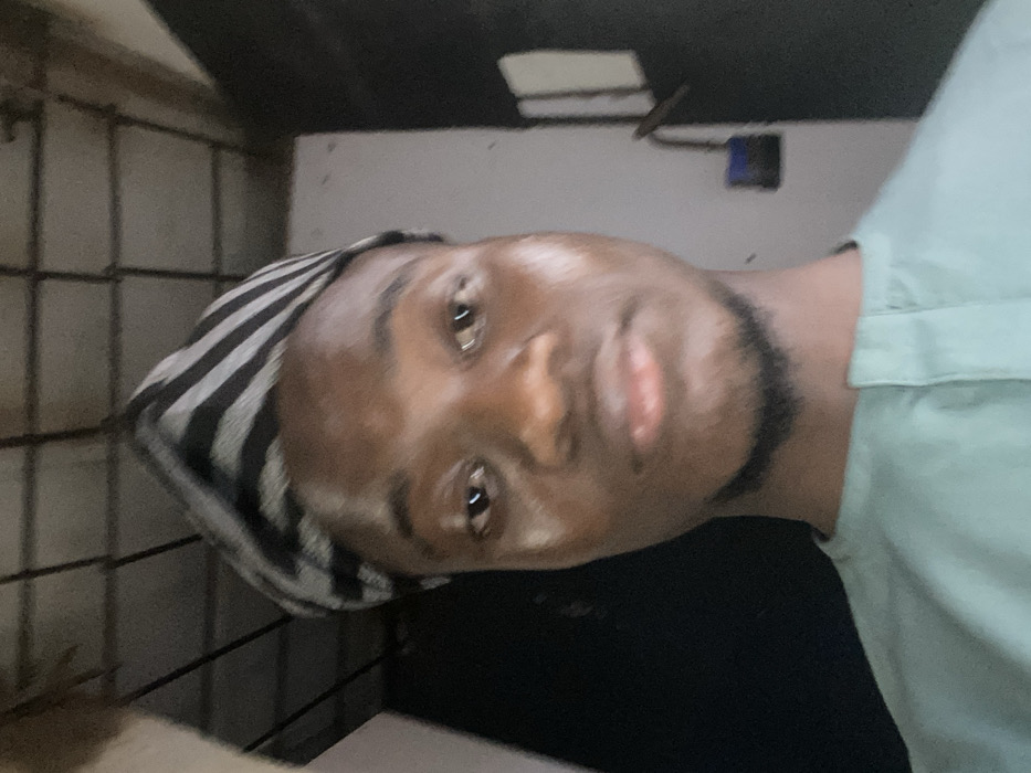 A close-up of a man's face is centered, slightly rotated. He has dark skin, a trimmed beard, and wears a striped head covering. His expression is neutral, and his eyes are open. A light green shirt is visible on his right shoulder. The background includes a wire grid on the left and a white surface with a rectangular opening above. A dark, possibly black, material is below his chin. The overall lighting is soft and diffused.