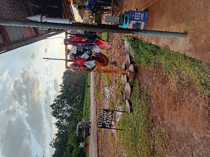 The scene depicts an outdoor environment in Idakho Central ward, Kenya, under an overcast sky, likely during late afternoon. The foreground features muddy dirt ground interspersed with patches of green grass. To the right, a section of a building with a corrugated metal roof overhang is visible, supported by a faded blue-green pole. A reddish-brown wooden display rack is suspended from the structure, exhibiting various items including patterned bags, red bandanas, and a red spade. Below the rack, approximately eight shallow, round, metallic pans are arranged on the muddy ground, some containing standing water. Adjacent to the supporting pole, a blue cardboard box with "ALTIPO" branding is present on the ground. Partially visible under the roof overhang to the far right is an individual seated at a table, wearing a blue garment. In the midground, a black sign on wooden stakes reads "ELECTRIC SHOP FUNDAGU" and is planted in the muddy ground. A wide, unpaved dirt road, marked by numerous puddles, traverses the image horizontally. A blue three-wheeled vehicle (tuk-tuk type) is parked on the left side of this road, facing left. Two individuals stand near this vehicle on the road's shoulder. A third individual is observed further down the road, walking away from the camera, on the opposite side of the road. The background features a dense line of green trees extending across the horizon, with faint power lines visible above. The sky is predominantly cloudy, with lighter areas visible towards the upper right. The ground throughout the visible area appears saturated, indicating recent rainfall.
