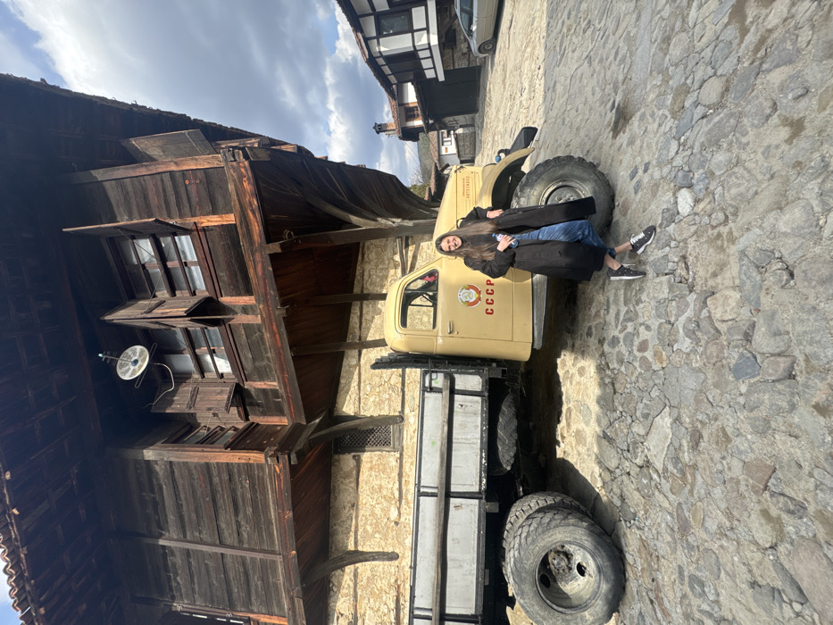 A young adult female stands centered in the right half of the frame, positioned to the left of a vintage, light tan-colored flatbed truck. She is dressed in a dark, knee-length coat, blue jeans, and dark sneakers with white soles, holding a clear plastic bottle in her left hand. Her right arm is extended, resting on the truck's fender above the front right wheel. The truck features dual rear wheels, and "CCCP" (Cyrillic for USSR) is painted in red letters on its driver's side door, below a circular emblem. The truck is parked on a cobblestone street, which occupies the lower third of the image. Behind the woman and truck, a traditional two-story Bulgarian house with an overhanging upper floor is visible. The lower story is constructed of light-colored stone, while the upper story is clad in dark horizontal wooden planks. Multiple windows with open dark wooden shutters are present on the upper floor, and a small, round satellite dish is mounted to the facade between two windows. In the background, to the right of the house, are additional traditional buildings with dark wooden beams and white plaster walls, under a partially cloudy sky. The scene is located in the city of Koprivshtitsa, Bulgaria.