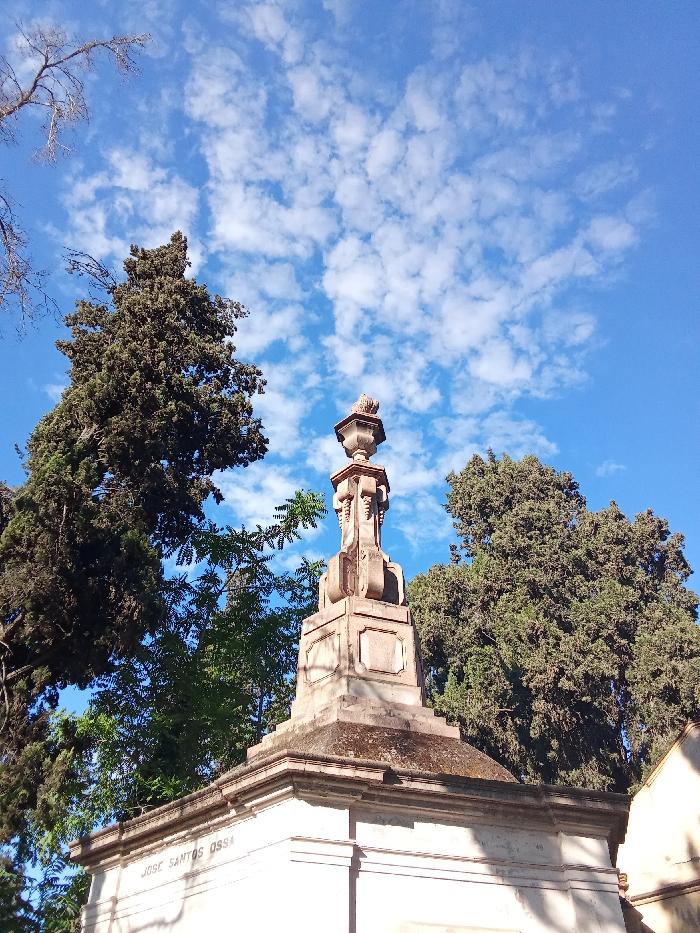 The image depicts a historical stone mausoleum or monument located within the Cementerio General de Santiago in Recoleta, Chile. The central subject is a multi-tiered, light-colored stone structure, possibly granite or marble, which shows signs of weathering and discoloration. The inscription "JOSE SANTOS OSSA" is visible on the upper front surface of the mausoleum's base. An ornate stone pedestal, topped with an urn-like finial, surmounts this base. Flanking the monument are tall, dense evergreen trees with dark green foliage. Bare tree branches are also visible against the sky in the upper left quadrant. The background consists of a bright blue sky dotted with numerous small, white cumulus clouds. The scene is illuminated by natural daylight, casting clear light on the structures and vegetation. No people or active elements are present.