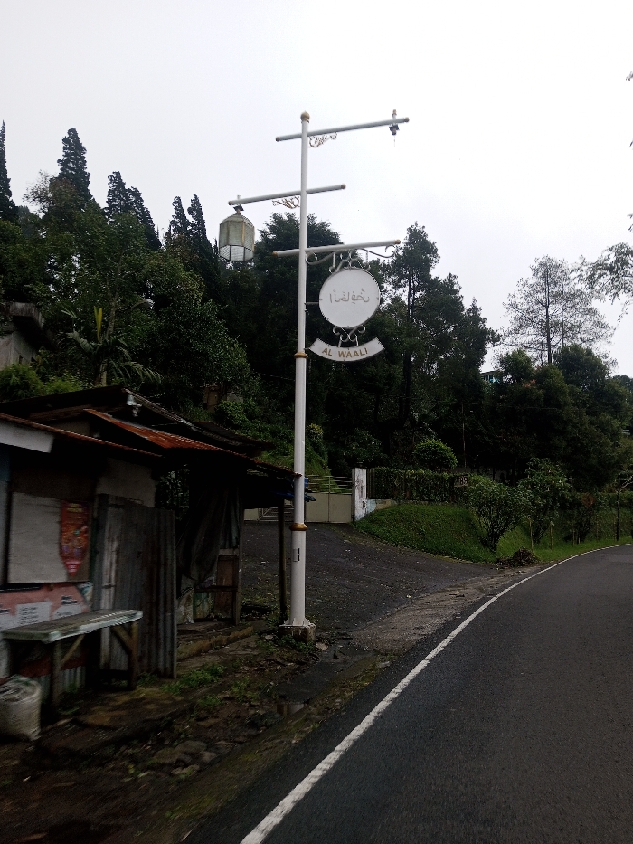 This image depicts a roadside scene in Bangtsho, Bhutan, under an overcast sky. A white, ornate streetlamp pole with gold finials stands centrally, featuring two crossbars. From the upper left crossbar hangs a caged lantern-style light fixture, while the lower right displays a circular white sign with Arabic script and "AL WAALI" in English, accompanied by a smaller curved banner also reading "AL WAALI". To the left, a weathered shack constructed from corrugated metal and wood features a rusty red roof overhang, a wooden bench, and a white sack on the ground, with obscured posters on its front. A dark asphalt road with a solid white edge line curves into the right foreground, while a dirt driveway leads uphill past the pole to a light-colored gate and low wall. Dense green foliage, including tall coniferous trees, covers the steep hillside and forms the background. No individuals are present.