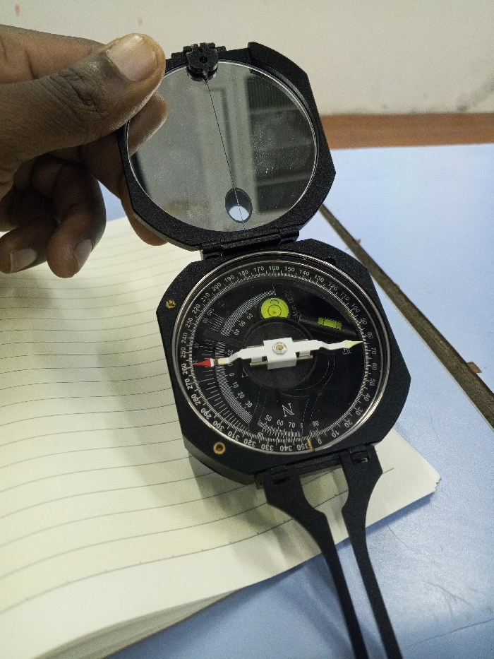 A handheld compass sits atop a lined notebook, held by a hand. The compass features a circular dial marked with degrees, a bubble level, and a directional needle. The dial ranges from 0 to 360 degrees, with North marked as "N". A hinged mirror is attached to the compass. Two black, elongated attachments extend from the compass's base, ending in a flared, triangular design. A wooden twig rests nearby, on the right side of the image.