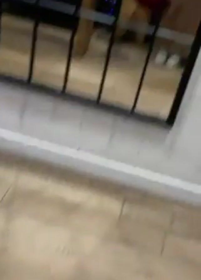 bouquet of red roses being held in someone's hands. The roses have large, dark red blooms and are surrounded by green leaves. The person holding the roses is wearing light-colored shorts or a skirt. The video then shows a reflection in a mirror where the person holding the flowers is visible wearing a light brown dress and white shoes. The reflection also shows a wooden stand, a black speaker system, and a green plant.