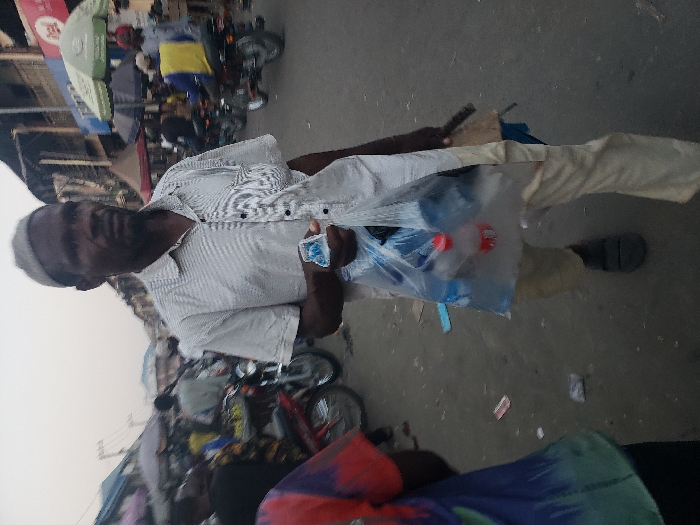 An elderly man, wearing a white cap and striped shirt, stands holding a clear plastic bag filled with bottled water. He has a paper product in his other hand. The background reveals a bustling street scene with motorcycles, pedestrians, and shops. The setting appears to be a busy market or commercial area. The photo is slightly blurred and possibly taken from a moving vehicle.