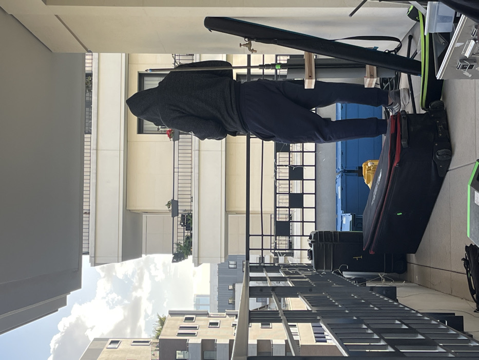 The scene is captured from a residential balcony in Saint-Ouen-sur-Seine, France, during daylight hours with a partly cloudy sky and visible sunlight. One individual is present, standing with their back to the camera, facing outward. The person is dressed in a dark grey hooded sweatshirt with the hood up, dark blue sweatpants, and grey athletic shoes. They appear to be stationary. The balcony features a light-colored tiled floor and a dark metal railing with a grid design. Several objects are placed on the balcony: a large, black, wheeled bag lies horizontally in the foreground. To the left, a tall, dark-colored hard case stands upright against the railing. To the right of the individual, a vertical pole or stand equipped with a small wooden shelf and a brass-colored spigot-like attachment is positioned. Another black case or bag leans against the wall behind this pole. A portion of a silver-colored hard case is visible in the bottom right corner. In the background, multiple modern residential buildings are visible. Directly opposite, a light-colored building with numerous balconies featuring black railings and potted plants is prominent. To the left, a taller, darker-toned modern building with many windows is present. In the far distance, a slender, tall structure is faintly discernible. Below the balcony's railing, on an apparent lower roof or terrace, several blue plastic storage crates and a yellow object are visible.