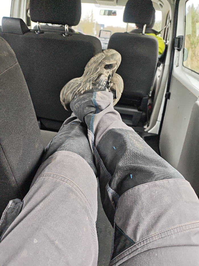 The image depicts a first-person, downward-angled view of an individual's lower body within the interior of a vehicle, located in Leudelange, Luxembourg. The individual wears grey work trousers featuring darker grey reinforced knee sections with visible blue stitching accents. The trousers show signs of dirt and wear. Light-colored, rugged work boots are present on the feet, which are crossed at the ankles and appear elevated. In the midground, directly ahead of the observer, two black upholstered vehicle headrests are visible. Beyond these, the back of a person, likely a driver or front passenger, is seen wearing a bright yellow high-visibility jacket. The vehicle's interior walls are white or light grey, and a rear-view mirror is visible. Through the vehicle's windows, a blurred outdoor environment is visible, characterized by green foliage suggesting trees or bushes alongside a road, under what appears to be an overcast daytime sky.