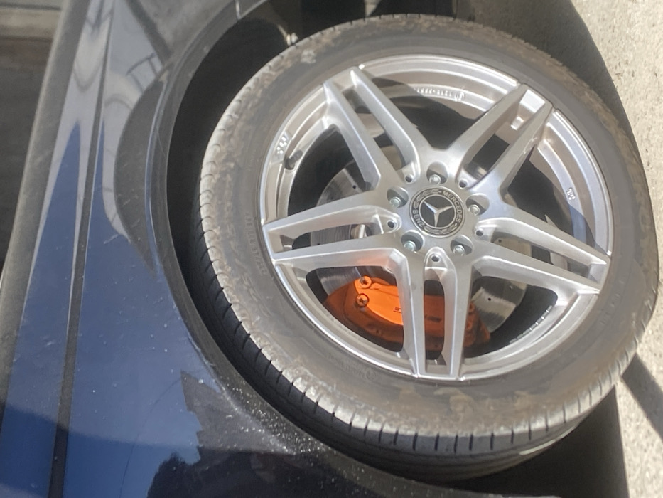 - "The image presents a close-up, forensic view of the front quarter panel and wheel assembly of a dark-colored passenger vehicle, identified as a Mercedes-Benz by the prominent logo on the wheel's center cap" by FM-frcry1, licensed under CC BY 4.0