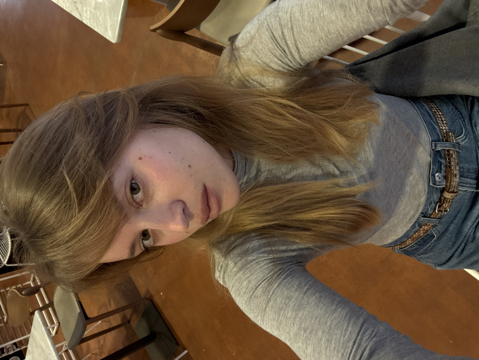 An indoor, high-angle portrait captures a young adult female looking directly into the camera. She has long, light brown hair with bangs, green eyes, and fair skin with visible moles on her right cheek. She is wearing a grey long-sleeved turtleneck shirt, blue denim jeans, and a braided light brown belt with a metal buckle. A grey garment is draped over her left side. The blurred background shows a commercial interior with a reddish-brown floor, white marble-topped square tables, and various chairs, including some with dark grey seats and others with light wooden backrests. The scene is located in the city of Fiumicino, Italy.