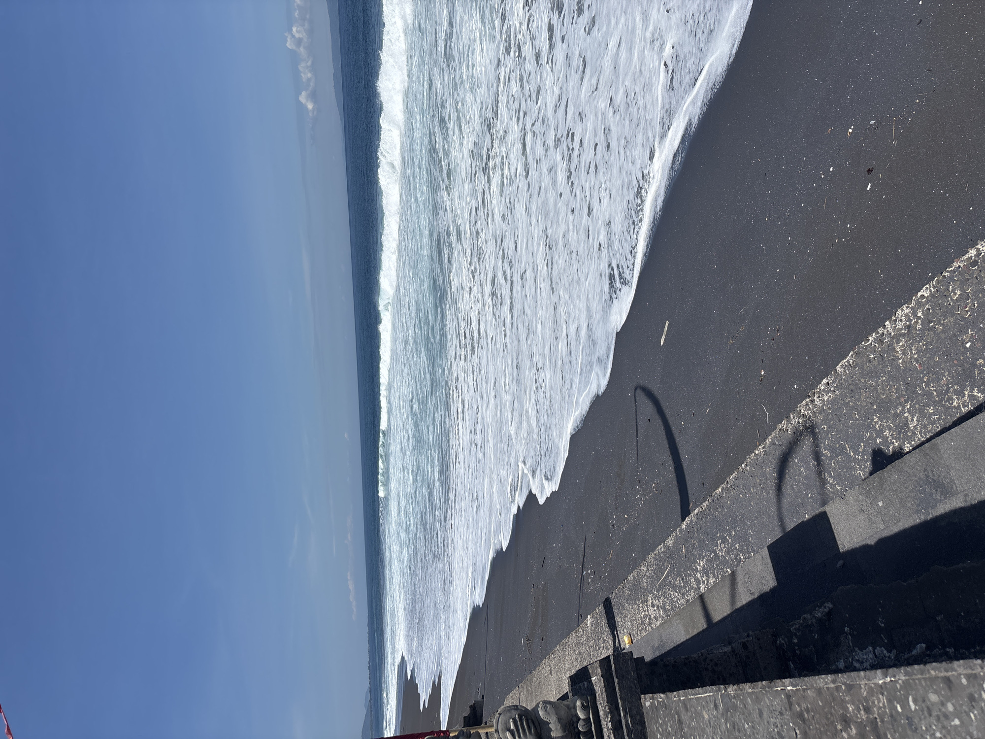 The image depicts a black sand beach with waves lapping at the shore. The sky is clear and blue. In the foreground, there's a concrete structure. The location is Blahbatuh, Indonesia.
