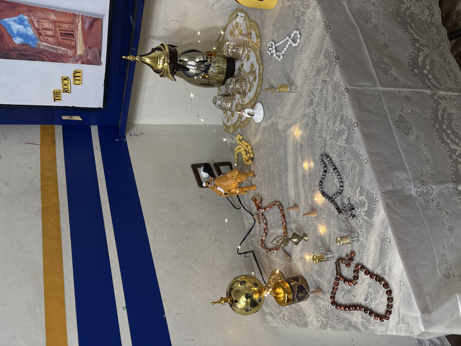 The image displays a static arrangement of cultural and decorative objects on a table in a corner of a room in Munin, Syria. The background features light-colored walls; the left wall is painted with two blue horizontal stripes and one yellow stripe above them, while the right wall holds a framed image of "THE ROCK CITY" (Petra). A black electrical cord extends from a wall outlet. The table is draped with a patterned, light-colored tablecloth and illuminated by scattered string lights. Prominently displayed on the table are a golden spherical censer, a cylindrical brown container, two small glass vials, a golden ornate vessel, and four distinct strands of prayer beads (one reddish-brown, one yellowish-white, one white, and one dark grey/black). A yellowish-brown camel figurine with a rider stands centrally. To the right, a golden thermal carafe and four clear glass cups are arranged on a round, golden-edged white tray. Several small, conical light brown objects are distributed across the display. No individuals are present in the scene.