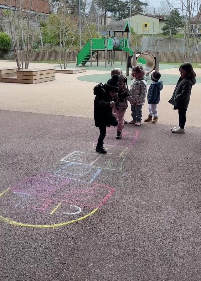 group of five young children playing hopscotch on an outdoor playground