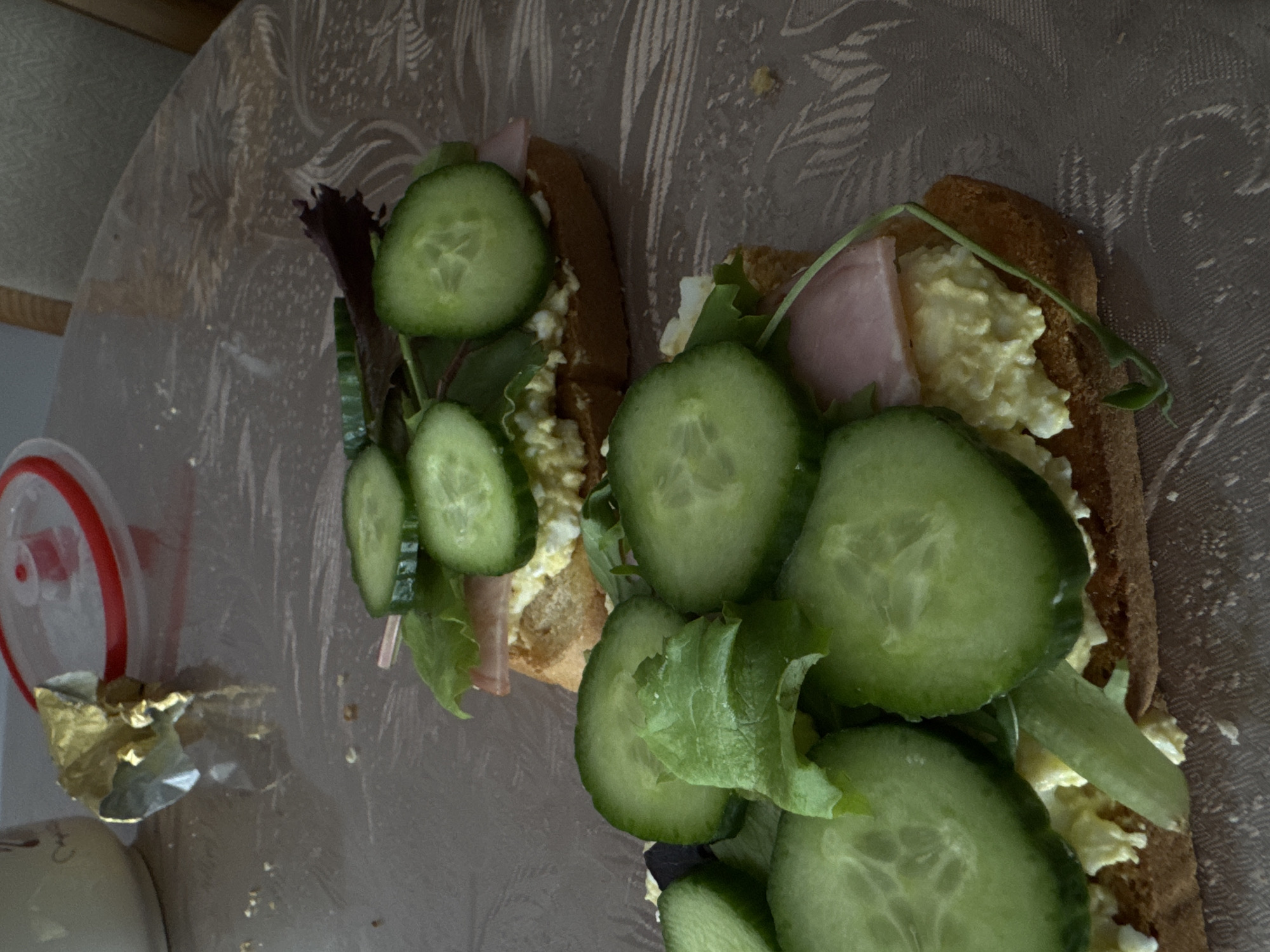 Two open-faced sandwiches are on a patterned surface, likely a table. The sandwiches contain bread, egg salad, ham, lettuce, and sliced cucumbers. A lidded container and crumpled foil are partially visible in the lower left corner. There is no indication of the location being Goce Delcev, Bulgaria. The scene shows food preparation or consumption.