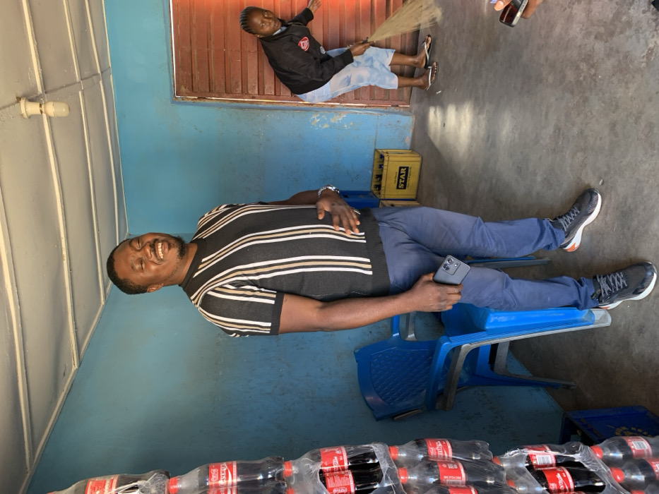 An indoor scene in Jos, Nigeria, depicts two individuals. In the foreground, a dark-skinned male with short dark hair and a beard, approximately 30-40 years old, stands smiling broadly with closed eyes. He wears a black short-sleeved striped shirt, dark blue trousers, and black and white athletic shoes, holding a dark-colored smartphone in his left hand and resting his right hand on his stomach. To his left, two blue plastic chairs are stacked against a light blue wall, beside a tall stack of plastic-bottled Coca-Cola. In the background right, a dark-skinned female, dressed in a black long-sleeved top, light blue capri pants, and black flip-flops, is bent over sweeping a light gray concrete floor with a natural fiber broom. A brown wooden door frame is visible behind her, and a yellow crate labeled "STAR" containing bottles rests nearby. The room features light blue walls and a white paneled ceiling with an exposed light bulb.