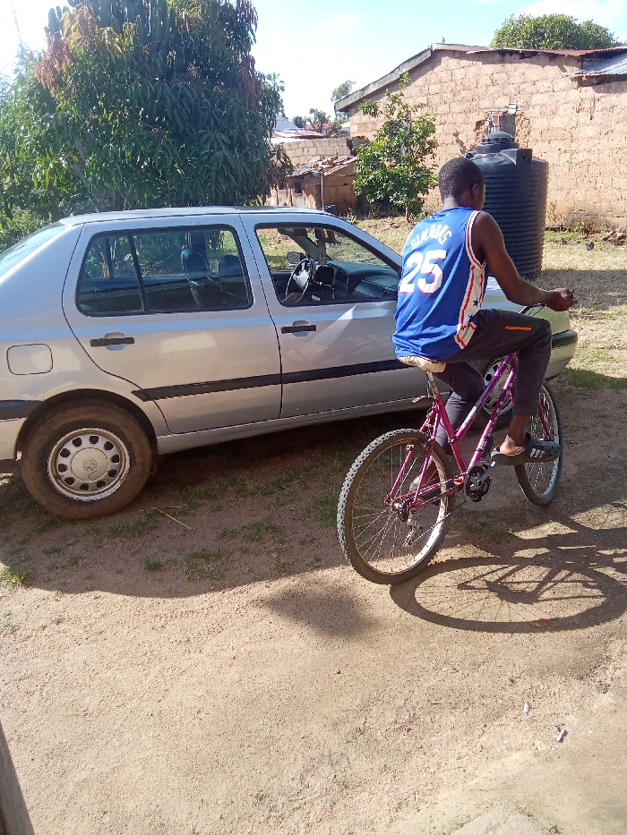 The image presents an outdoor scene in Jos, Nigeria, under bright daylight. A dark-skinned male, viewed from behind, is riding a pink/purple mountain bicycle from left to right across a dirt path. He is wearing a blue sleeveless jersey with "SUNWARDS 25" in white lettering on the back, dark trousers, and black slide sandals with white stripes. The bicycle has silver-colored wheel rims and visible gears. To the left of the cyclist, a silver Volkswagen Golf Mk3 sedan is parked on the dirt, facing left. Its driver's side front window is rolled down, exposing the black interior and steering wheel. The car features black side molding and silver wheel hubcaps. The immediate ground consists of dry, light brown dirt with scattered patches of green grass. Shadows cast by the bicycle and a nearby structure indicate direct sunlight. In the background, multiple single-story buildings are visible, constructed from unpainted reddish-brown bricks with corrugated metal roofs. A large, black plastic water storage tank is situated beside one of these buildings on the right side of the frame. Various green trees and shrubs are dispersed throughout the background, with a prominent large tree with dense foliage on the far left. The sky above is clear blue with minimal cloud cover.