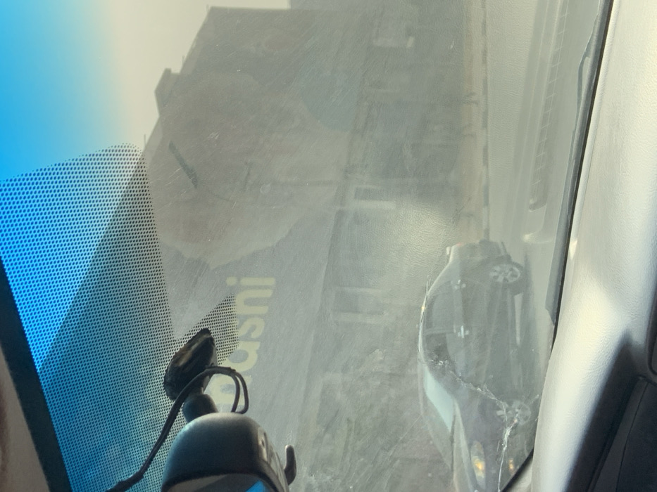 The image depicts a street scene in Abuja, Nigeria, viewed from inside a vehicle through a dirty and partially cracked windshield. A dashcam or similar device is mounted on the upper left interior of the windshield. In the mid-ground, a dark-colored sedan, possibly blue or black, is visible on an asphalt road, traveling from left to right. Its front section, including a yellow headlight, is discernible. In the background, a large, multi-story commercial building with a light brown or tan exterior stands under a hazy, pale blue sky, indicative of dusty conditions or Harmattan season. The building features multiple windows. A prominent yellow sign is affixed to the building, displaying inverted text that reads "insuj" from the viewer's perspective, which would correctly display as "JUSNI" from the exterior. This signage is characteristic of the Jusnitel office building located on Obafemi Awolowo Way, Utako, Abuja. No clear individuals or specific interactions are visible on the road or near the building. The scene portrays a typical urban environment during daylight hours.