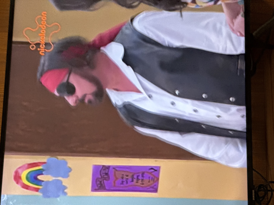 The image is a photograph of a television screen displaying a scene from a program. The location in Kazanlak, Bulgaria, is not discernible from the visual information provided. The central subject is a male individual, shown from the chest up in left profile, wearing what appears to be a pirate costume. He has a dark beard, a red bandana tied around his head with the tail extending down his back, and a black eye patch over his right eye. His attire consists of a white long-sleeved collared shirt, partially unbuttoned, and a dark (likely black) button-up vest with multiple silver-colored buttons. He is looking towards the left side of the frame. To his right, a second person is partially visible, showing a shoulder and part of an arm, with dark hair. The background of the displayed scene features a light yellow wall on the left, adorned with a colorful rainbow cutout above two blue cloud cutouts, and a rectangular purple poster or graphic with indistinct text and imagery below it. To the right of the yellow wall is a brown wall or door. In the upper right corner of the screen, the orange "Nickelodeon" logo with its characteristic splat design is visible. The bottom left bezel of the television set shows a faint "SAMSUNG" logo.