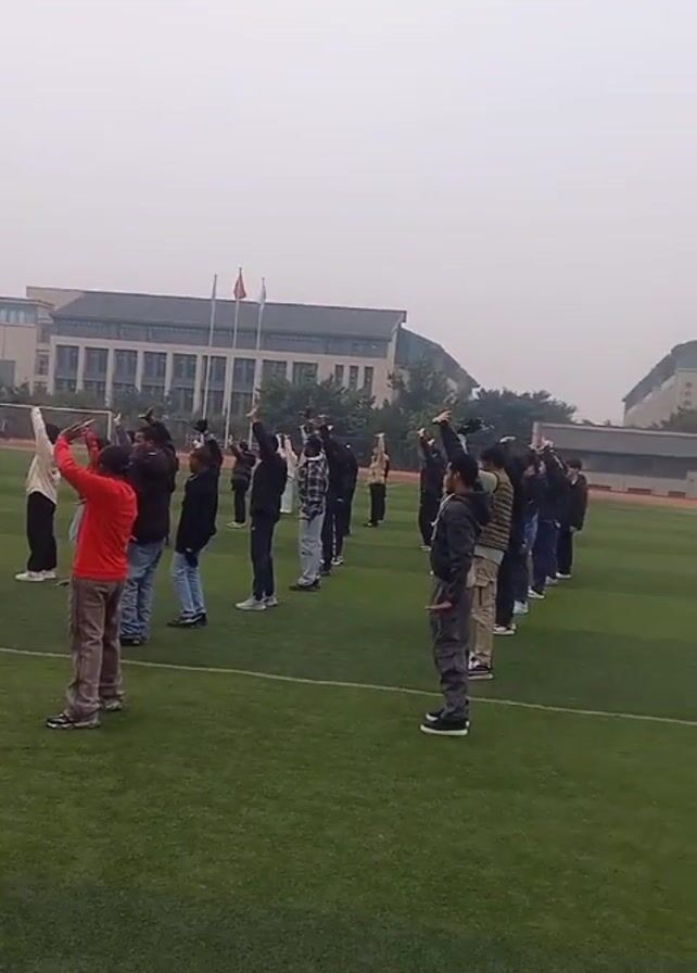 group of people standing on a green field and doing a stretching exercise. The group consists of about 30 people of various ages and ethnicities. They are spread out in a loose formation, with some people standing closer together than others. Most people are wearing casual clothing, and several are wearing hats. They are all facing the same direction, with their arms raised above their heads, and their hands clasped together. The group appears to be stretching in unison. In the background, there is a building with a gray roof and two flag poles, as well as a stadium. The sky is overcast, and the lighting is dim. The overall scene appears to be taking place on a college campus.