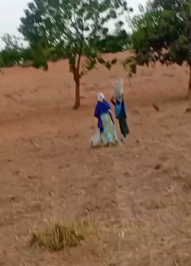 two women carrying buckets on their heads walking on a dry, brown field with sparse vegetation. A tree is visible in the background. The video is slightly shaky. The women are wearing colorful clothing. Later, two men wearing robes walk into the frame and away from the camera. The sky is overcast.