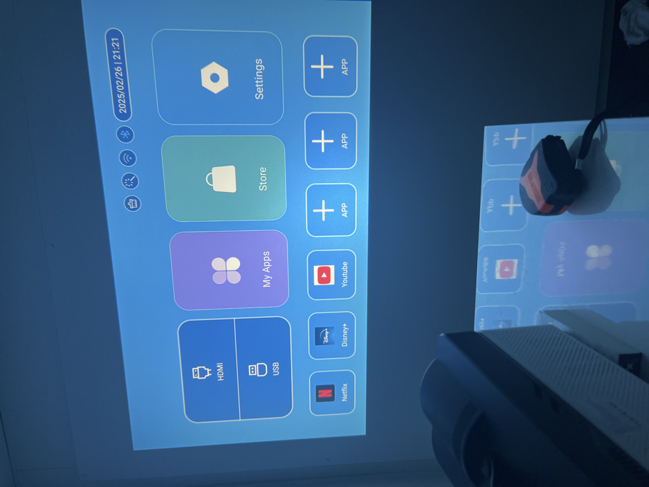 An indoor scene features a digital projector casting a blue-toned user interface onto a light-colored wall. The projected interface displays large rectangular icons for HDMI, USB, My Apps, Store, Settings, Netflix, Disney+, YouTube, and three generic 'APP' placeholders. In the upper right corner of the projection, the date and time '2025/02/26 | 21:21' are visible, accompanied by status icons including Wi-Fi and Bluetooth indicators. In the lower left foreground, a black and white portable projector is partially visible, resting on a highly reflective surface. To its right, a small black device with orange details, possibly a remote control, is connected by a black cable and also sits on this reflective surface, which mirrors the bottom section of the projected screen. The ambient lighting is dim, with the projector output serving as the primary light source. No individuals are depicted. No visual evidence within this image corroborates a specific location in Eindhoven, Netherlands.