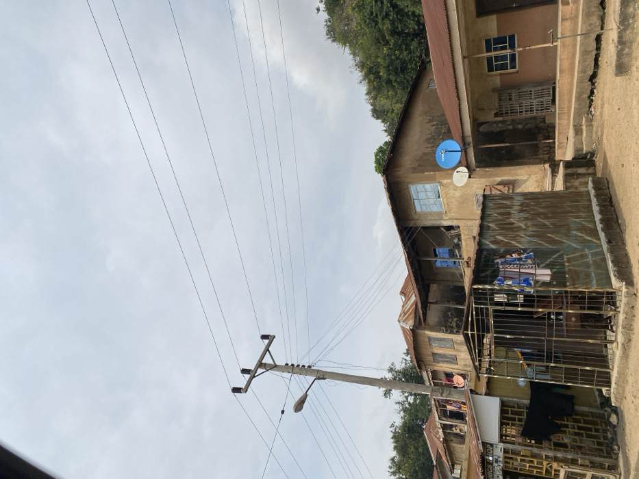 This image depicts a street scene in Okengwe - Obehira, Nigeria, under an overcast sky. The foreground features unpaved, light-colored ground. In the mid-ground, a tall, grey concrete utility pole with a street light fixture stands prominently on the left, supporting multiple black power lines that stretch horizontally across the frame. The central and right portions of the image are dominated by a cluster of single and two-story buildings, characterized by earth-toned, unpainted walls and rusted corrugated metal roofs. * On the far left, a partial view of a building with a "ELECTRONICS SHOP" sign shows dark clothes hanging to dry on metal grates. * Adjacent to this, a freestanding rectangular enclosure made of heavily rusted corrugated metal sheets with a barred metal gate is visible. Inside, clothes are hanging, and a dark object, possibly a sewing machine, is discernible. * Behind this enclosure, a two-story building features faded, unpainted walls, a rusted corrugated roof, and a balcony or open area on the upper floor. Some windows have blue frames or reflective blue panes, while others appear boarded or shuttered. A white satellite dish is mounted on its facade. * To the right, a one-story building with a reddish-brown corrugated metal roof has two-toned walls (lighter brown base, darker brown upper). It features windows with blue frames and security grates, and a dark door. A blue satellite dish with "GHS" branding is affixed to its exterior. Raised steps or a platform lead to this building. Dense green trees are visible on an elevated terrain or hillside in the background, particularly on the right side of the frame. No individuals are visible within the scene.