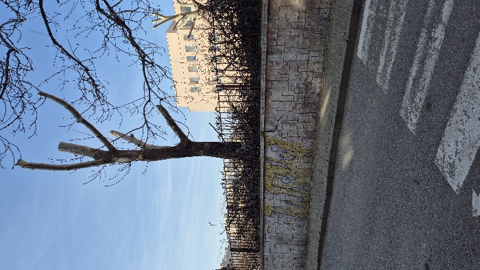 The scene depicts a street view in Sliven, Bulgaria, under a clear blue sky. In the foreground, an asphalt road with a pedestrian zebra crossing, marked by three white stripes, is visible. A concrete curb separates the road from a narrow sidewalk. Above the sidewalk, a textured stone or concrete block wall runs horizontally, featuring yellow and purple graffiti. This wall is topped by a black metal fence with decorative spires, behind which dense, dark leafless bushes are present. Dominating the mid-ground is a severely pruned deciduous tree, bare of leaves, with several large branches cut bluntly. Further in the background, behind the fence and other bare tree branches, a light pink or beige multi-story building with multiple rectangular windows is visible. The scene is devoid of people or active subjects.