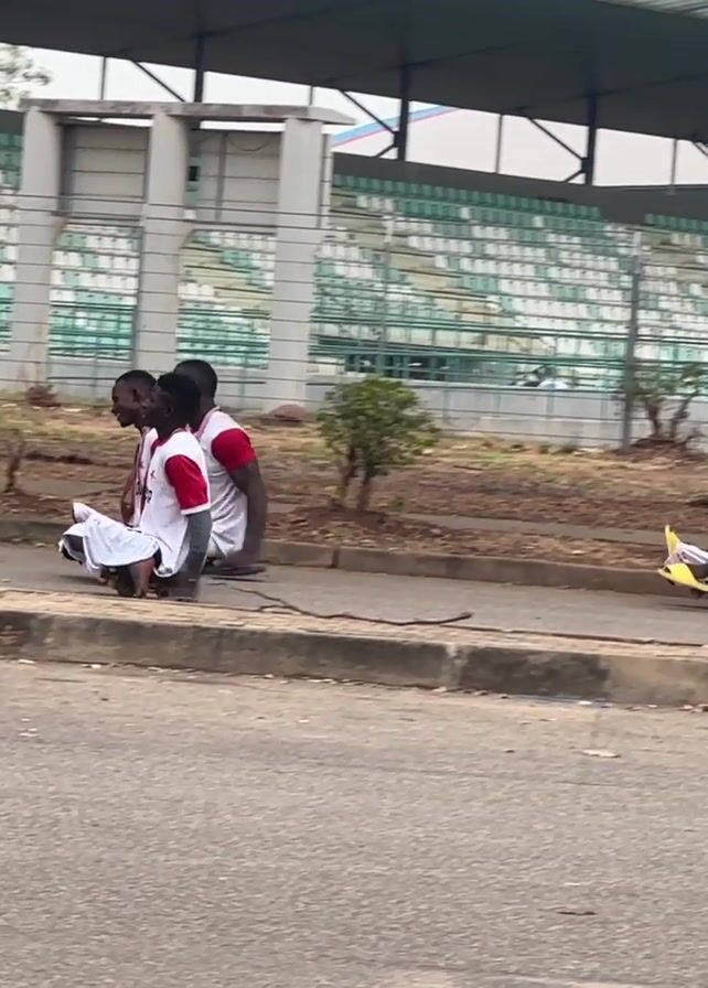 four boys sitting on the road in front of a stadium. They are wearing white tops with red sleeves and white bottoms. One boy is sitting on his own a few feet away from the other three. The other three are clustered together. The road is asphalt and has a curb on either side. The stadium in the background has green and white seats. There are trees around the stadium. A maroon car can be seen in the foreground.