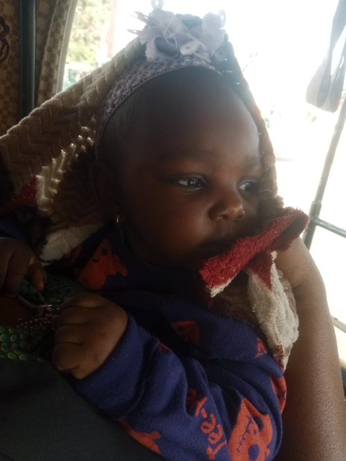 An infant, located in Jos, Nigeria, is depicted in a medium close-up, held by an adult. The infant wears a light purple crocheted headband adorned with white fabric flowers and a navy blue long-sleeved garment featuring orange cartoon characters. A multi-patterned blanket or towel, exhibiting hues of brown, tan, white, and red, is draped across the infant's upper torso and partially obscures the right side of the face with a red and white textured fabric piece near the mouth. The infant's left hand, partially fisted, grasps a dark, possibly beaded, object. The infant's gaze is directed towards the right side of the frame. A dark-skinned arm and shoulder, belonging to the adult holding the infant, are visible on the right. The background is significantly overexposed and out of focus, indicating an external environment viewed through an opening, potentially from within a vehicle or by a window. A vertical light-colored metallic bar is discernible on the right side of the background.