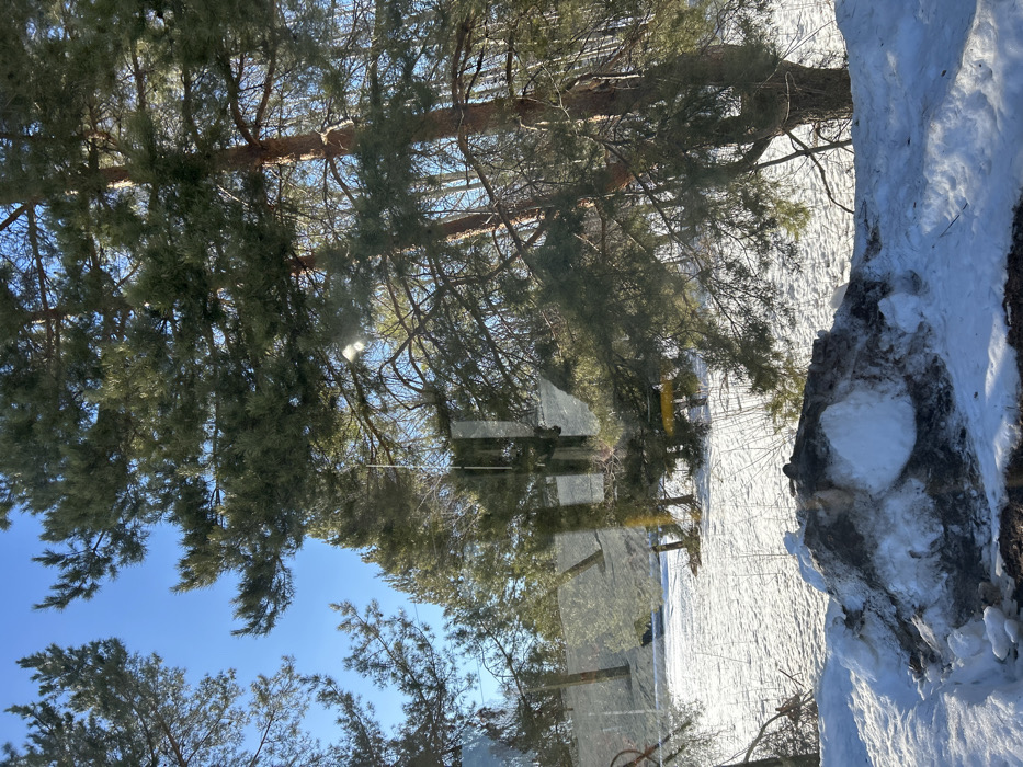 The image presents a snow-covered outdoor landscape in Ural'skoe, Russia, under a clear blue sky. In the foreground, a prominent mound of dirty snow and dark earth is visible. Beyond this, a wide, flat expanse of white snow extends into the midground, featuring faint linear patterns. Numerous trees, predominantly evergreen conifers with dark green needles and brown trunks, are scattered throughout the midground and background. Some bare deciduous tree branches are also discernible in the distance. A reflective surface, likely glass, partially overlays the scene, showing faint vertical lines and bright light reflections. No individuals, specific actions, or interactions are present in the frame. The scene is illuminated by direct sunlight, indicating a clear day.
