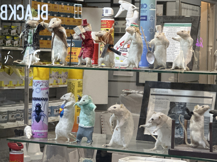 - "This image captures a retail shop window display in Paris, France, featuring thirteen taxidermied rats arranged on two clear glass shelves" by FM-u386i2, licensed under CC BY 4.0