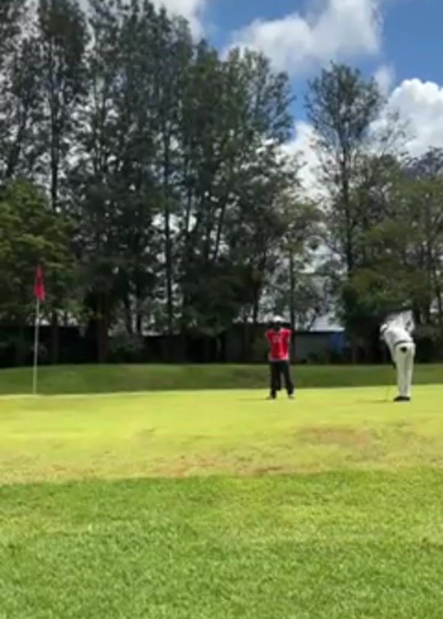 golfer putting on a green with a red flag marking the hole. Another person in a red shirt is watching the golfer. The sky is partly cloudy, and there are tall trees in the background. The golf course appears well-maintained.