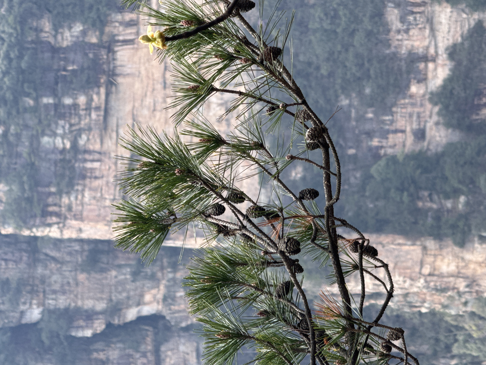 The image presents a natural landscape view in Luoguta, China, dominated by a sharply focused conifer branch in the foreground against a blurred mountainous background. A dark brown, gnarled tree branch, likely pine, extends diagonally across the upper half of the frame from the left to the right. This branch is densely populated with clusters of long, vibrant green pine needles and multiple small, ovoid, brown pine cones. A single, distinct, yellow, bud-like flower or structure is visible on the far right segment of the branch. The background consists of large, out-of-focus rock formations and mountains, exhibiting shades of light brown, grey, and indistinct green vegetation, characteristic of a rugged, possibly karstic, terrain. The scene displays significant atmospheric depth, with details softening into a haze in the distance. No human subjects, actions, or direct interactions are discernible within the frame.