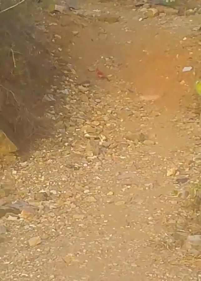 cardinal bird walking on a dirt path covered in small rocks and some litter. To the left of the path is a small bush. The bird is moving towards the center of the path. The lighting appears to be bright and sunny.